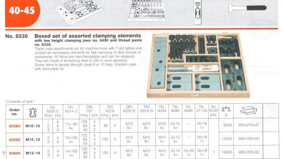- محتویات کلیدی: این ست شامل قید و بست های متنوعی است و اغلب همراه با گیره های فشاری عمیق (Deep Clamping Jaws) شماره ۶۴۹۰ و خمیر پیچ (Screw Paste) شماره ۶۳۳۹ عرضه میشود. همچنین المانهای استاندارد دیگری مانند پیچهای T-Slot، مهرههای فلنجی، واشرها، ستونهای نگهدارنده، و سایر المانهای ضروری را دربر میگیرد که ابعاد و تعداد دقیق هر جزء بر اساس کدهای استاندارد مشخص شدهاند (مانند DIN ۶۳۳۰B، DIN ۷۸۷ و...).