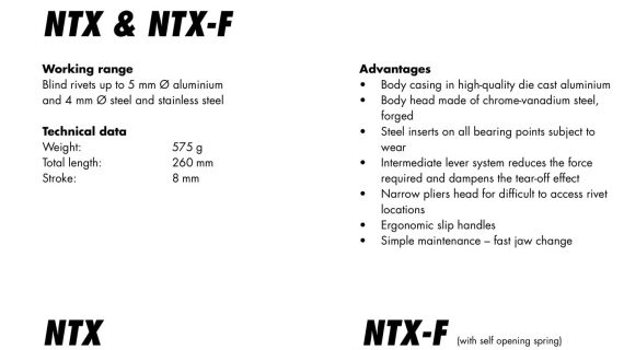 مدل NTX-F با سیستم اهرمی میانی، نیروی مورد نیاز برای پرچکاری را کاهش داده و ضربه ناشی از شکست میله را جذب میکند. این ابزار دارای دستههای ارگونومیک و ضد لغزش و فنر بازگشت برای خروج خودکار میلههای پرچ مصرفشده میباشد.en.gesipa.de